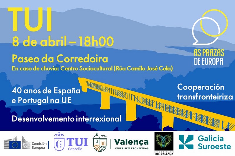 A Eurocidade Tui- Valença acollerá o próximo martes 8 de abril a 20ª edición da iniciativa “As prazas de Europa”, impulsada pola Comisión Europea, en colaboración co Concello de Tui, a Cámara de Valença e Galicia Suroeste. Esta actividade terá lugar no Paseo da Corredoira en horario de 18 a 20 h, ou en caso de choiva no espazo sociocultural da rúa Camilo José Cela.