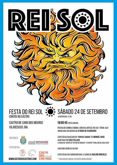 A Festa do Rei Sol toma o seu nome dunha lenda que conta como cada día se sentaba o Rei Sol ao pé do castro de Cano dos Mouros a contemplar o solpor. Isto é precisamente o que nos invitan a facer os veciños de Viladesuso por segundo ano consecutivo, coa diferenza de que nesta edición faise especial fincapé en recuperar a tradición oral vinculada ao lugar. A proposta ‘Contos no Castro’ nace para encher de lendas o castro de Cano dos Mouros, situado nesta parroquia oiense.
