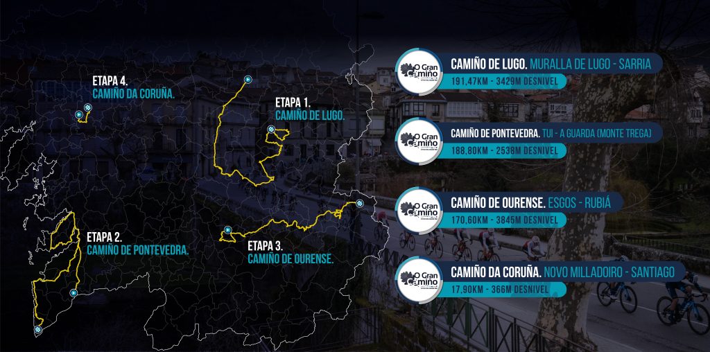 O Gran Camiño será do 23 ao 26 de febreiro, catro días nos que o pelotón atravesará parte das diferentes paraxes da nosa rexión. Cada unha das catro provincias que conforman Galicia será protagonista nunha das catro etapas, cun percorrido moi atractivo tanto para o corredor como para o espectador, onde por seguro viviranse grandes momentos de loita, estratexia e deportividade.