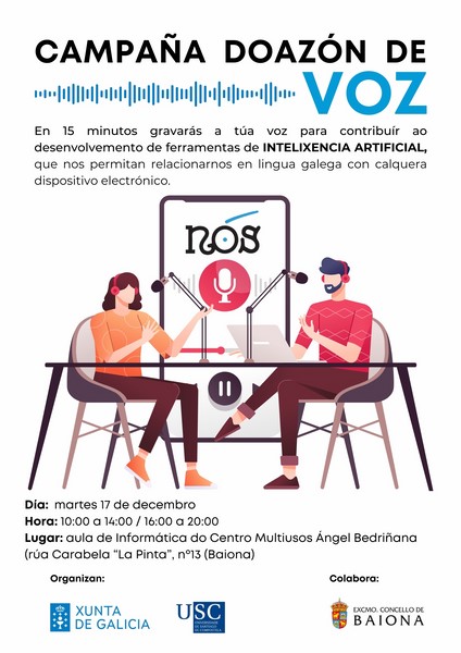 O vindeiro martes 17 de Decembro, o Concello de Baiona acollerá unha xornada de “captación de voz” en lingua galega. A campaña está promovida pola Secretaría Xeral da Lingua da Xunta de Galicia, no marco do “Proxecto Nós”. A recollida de voces realizarase no aula de informática na planta baixa do Centro Multiusos Angel Bedriñana de Baiona. O horario será pola mañá, de 10:00 a 14:00 horas, e pola tarde, de 16:00 a 20:00 horas. Todas as persoas que participen recibirán un agasallo pola súa colaboración.