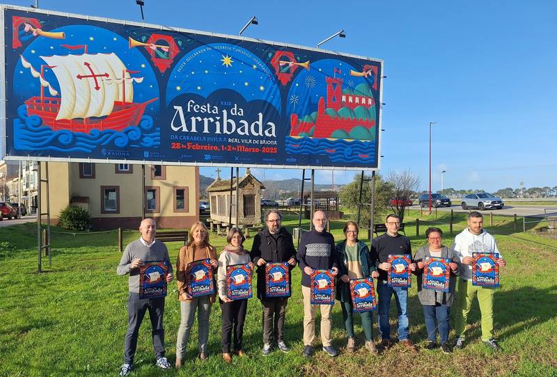 Nun acto celebrado en Sabarís ao que acudiron o alcalde de Baiona, Jesús Vázquez Almuiña, Concelleiros e o deseñador e ilustrador da imaxe, David Sierra, presentouse a imaxe da XIX Festa da Arribada 2025, que se celebrará do 28 de febreiro ao 2 de marzo.