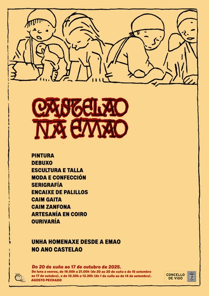 A inauguración da Exposición “Castelao na EMAO”, comisariada polo profesorado das especialidades de Serigrafía artística e Talla e escultura en madeira da Escola municipal de Artes e Oficios (EMAO), terá lugar o venres, día 20 de xuño, ás 19,00h, no Espazo EMAO.