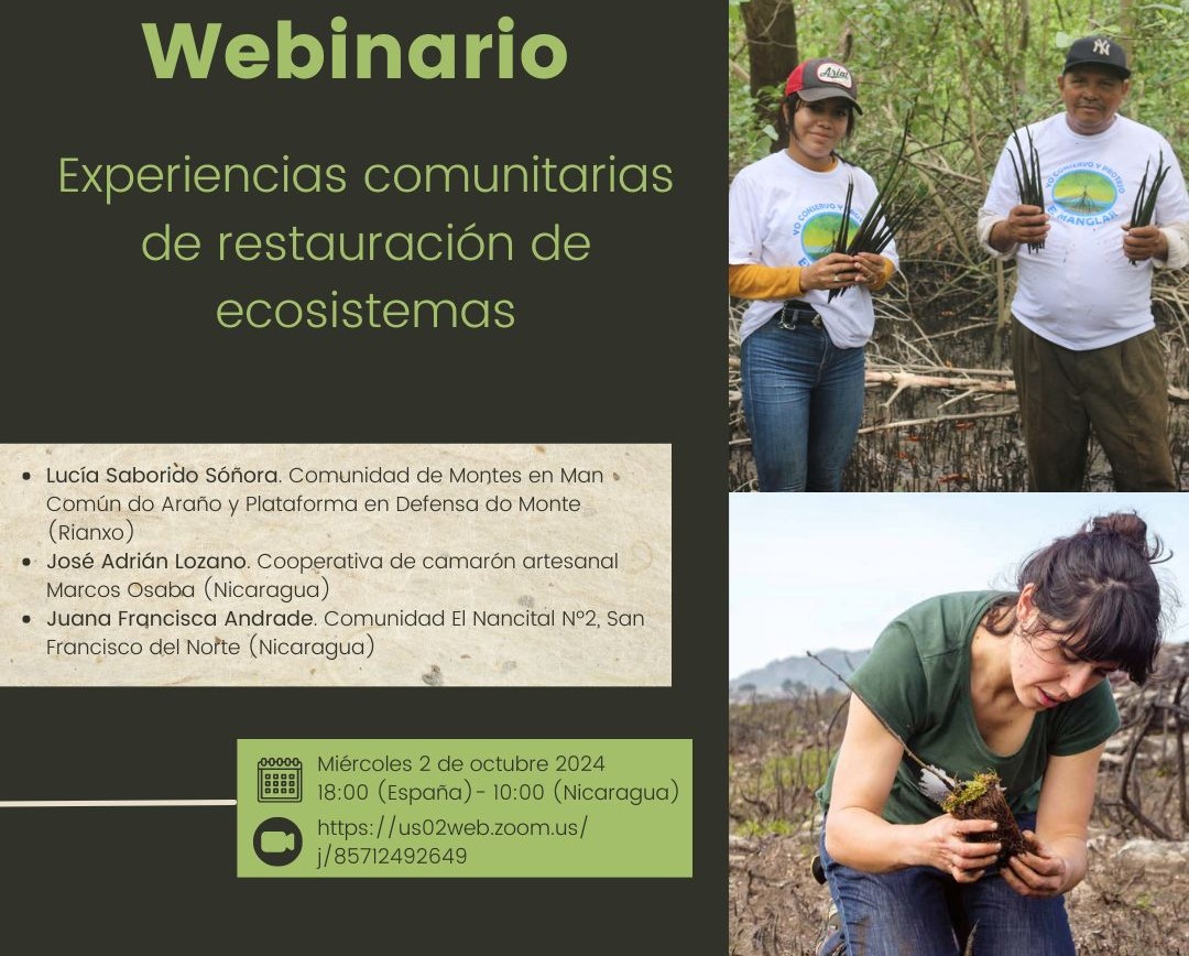 Con este webinario, búscanse divulgar boas prácticas de restauración ecolóxica baseadas na reforestación de bosques tallados ou queimados, eliminación de especies invasoras, recuperación de especies autóctonas, protección da biodiversidade ou renaturalización da paisaxe. Deste xeito, tras a benvida do presidente do Fondo Galego e alcalde de Nigrán, Juan González, tomará a palabra Lucía Saborido, en nome da Comunidade de Montes en Man Común do Araño e da Plataforma pola Defensa do Monte (Rianxo). Desde Nicaragua, intervirán a continuación José Adrián Lozano, socio da cooperativa artesanal de camarón Marcos Osaba, e Juana Francisca Andrade, portavoz da comunidade de El Nacital nº2. A sesión estará moderada por Laura Casal, responsable de Cooperación en Amigas da Terra.