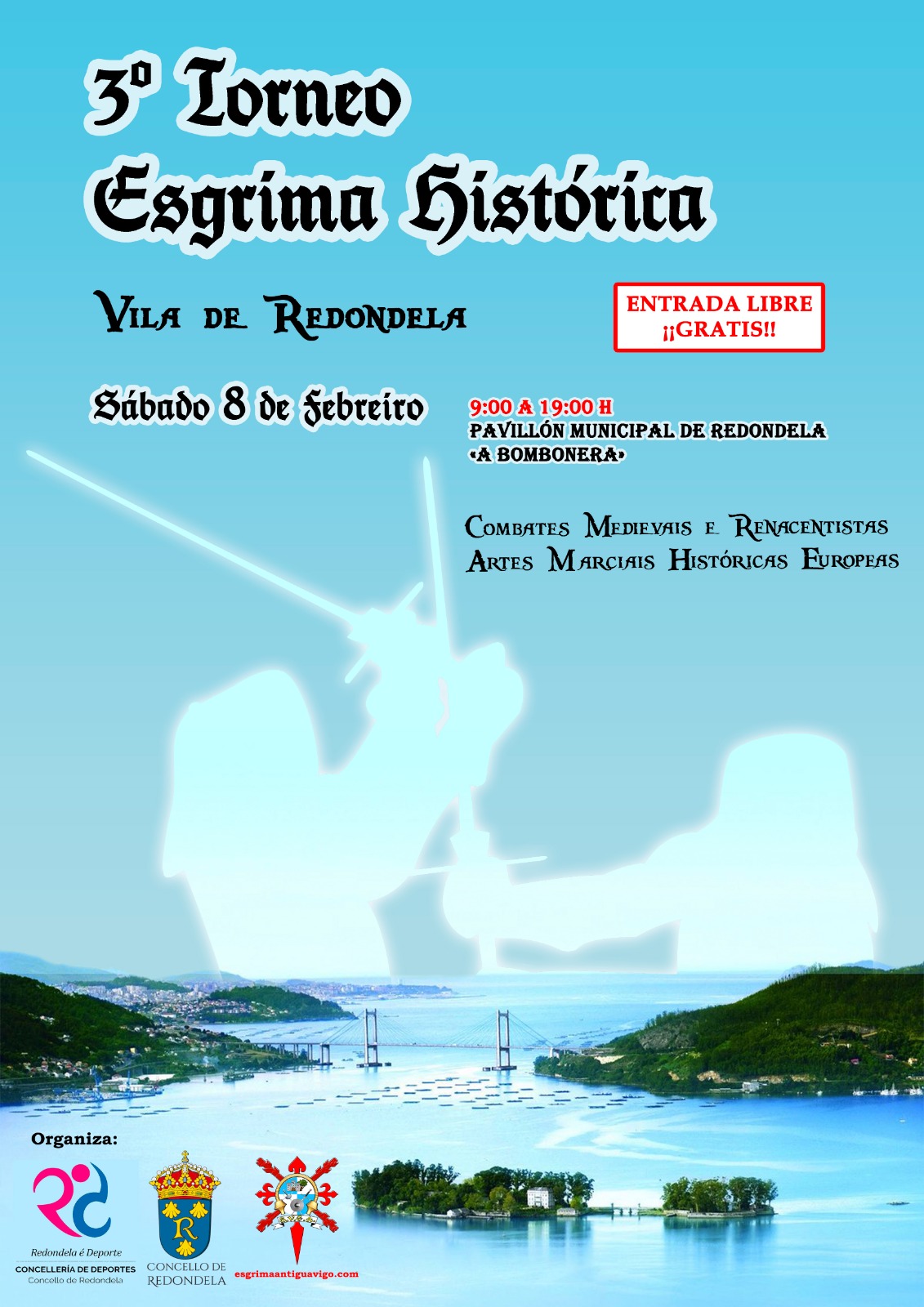 A terceira edición do ‘Torneo de esgrima histórica Vila de Redondela’ coverterán este municipio na capital de Galicia da esgrima antiga. Se celebrará o sábado 8 de febreiro, a partir das 9,00h no pavillón de Redondela, coñecido popularmente como ‘A bombonera’ e nel participarán máis de 60 deportistas representando a 15 salas de toda España e Portugal.