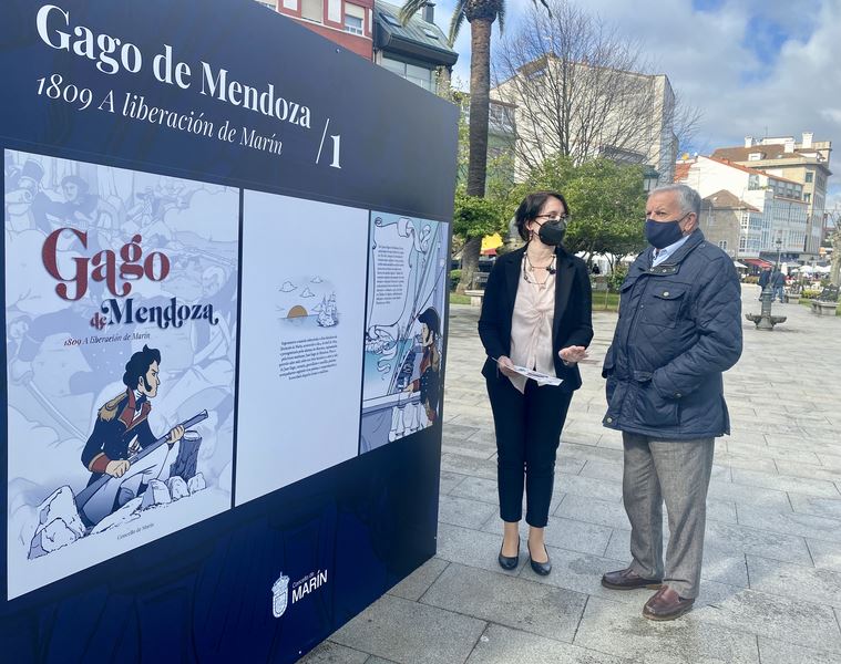 A concelleira Itziar Álvarez e o presidente da Asociación Ademar, Manuel Torres, visitaron o cubo colocado polo Concello na Alameda Rosalía de Castro, no que se reproducen diversas esceas do cómic que se elaborou explicando a historia do heroe marinense.