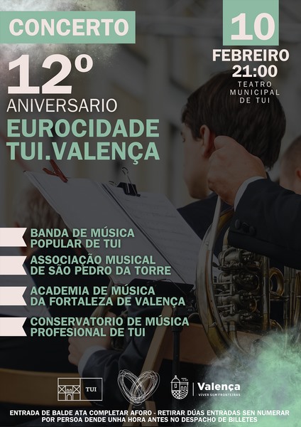 A Eurocidade Tui-Valença celebrará o seu décimo segundo aniversario o próximo sábado, 10 de febreiro, ás 21 h no Teatro Municipal de Tui nun concerto a cargo de catro agrupacións tudenses e valencianas