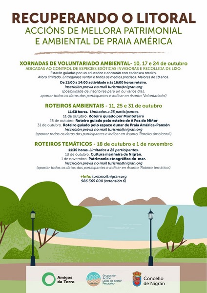 O Concello de Nigrán abre o prazo de inscrición para participar no novo programa de voluntariado ambiental incluído no proxecto do GALP ‘Recuperando o litoral. Accións de mellora patrimonial e ambiental de Praia América e Panxón’. Ademais, enmarcado tamén no ámbito divulgativo deste proxecto, haberá diferentes roteiros ao longo do mes, todos con inscrición previa e limite de aforo por protocolo sanitario.