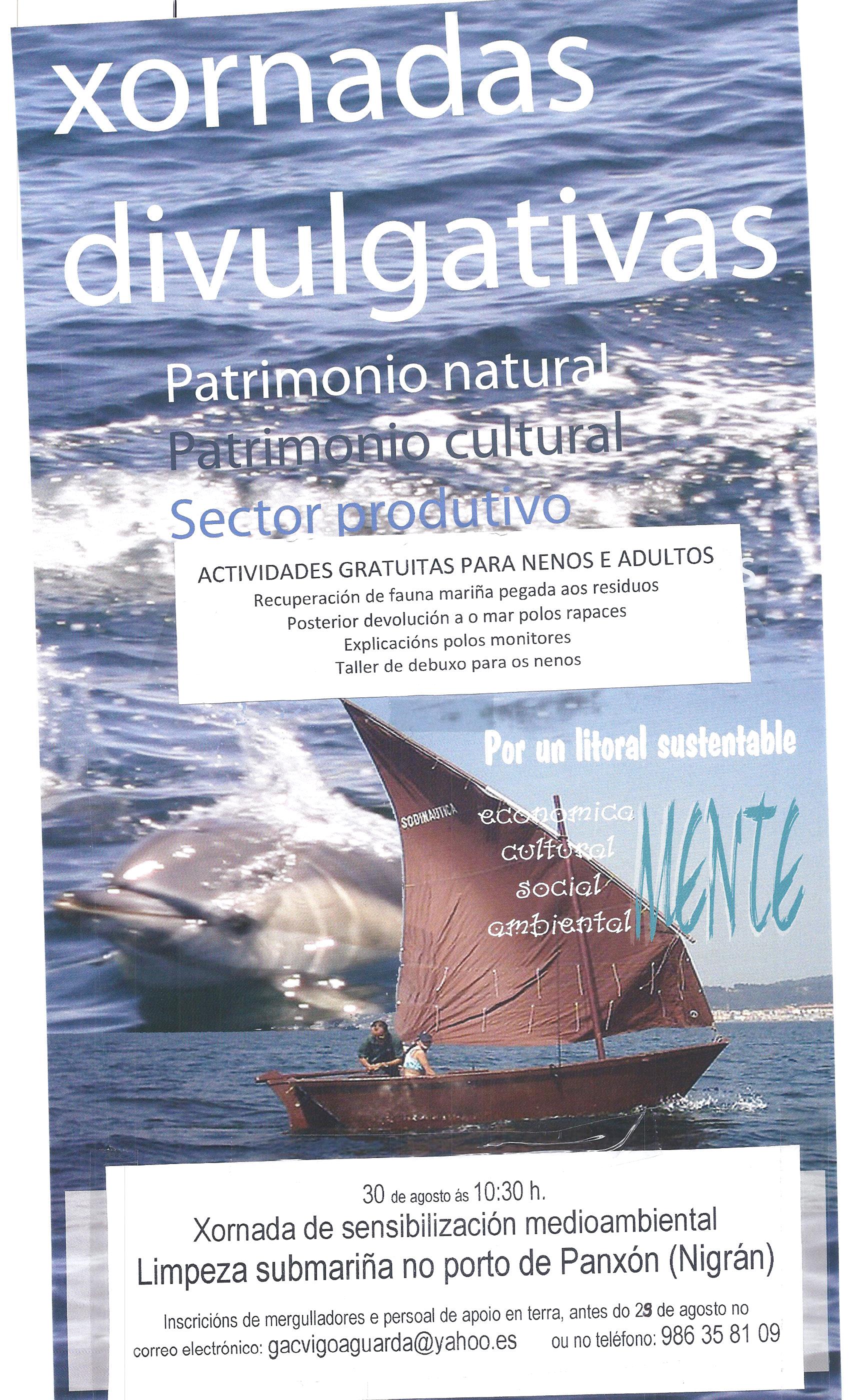 O vindeiro sábado 30 de agosto Nigrán acollerá unha xornada de sensibilización medioambiental no porto de Panxón a través da limpeza submarina do porto de Panxón. A actividade, organizada polo Grupo de Acción Costeira Ría de Vigo A Guarda en colaboración co Concello de Nigrán, a Cofradía de Pescadores “La Anunciada” de Baiona, a Asociación de Redeiras Baixo Miño-Atalaya, a CEMMA, a Plataforma por la Defensa de la Ría de Vigo-Cíes, ADEGA y SOCOMGAL, dará comenzo ás 10.30 horas, estando aberta ao público.