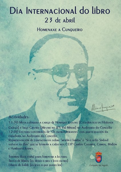 O Concello de Nigrán celebra o Día do Libro este propio venres 23 de abril no Auditorio Municipal cunha xornada matinal adicada á figura de Álvaro Cunqueiro ao coincidir este 2021 co seu 40 cabodano. O obxectivo do goberno local é promover a lectura entre a veciñanza e, ao mesmo tempo, a propia lingua galega a través dun dos seus escritores máis ilustres. Así, ademais de analizar a figura de Cunqueiro, instalaranse dous stans con gran variedade de libros para levar de balde e outro de troco (deixo un e levo outro).