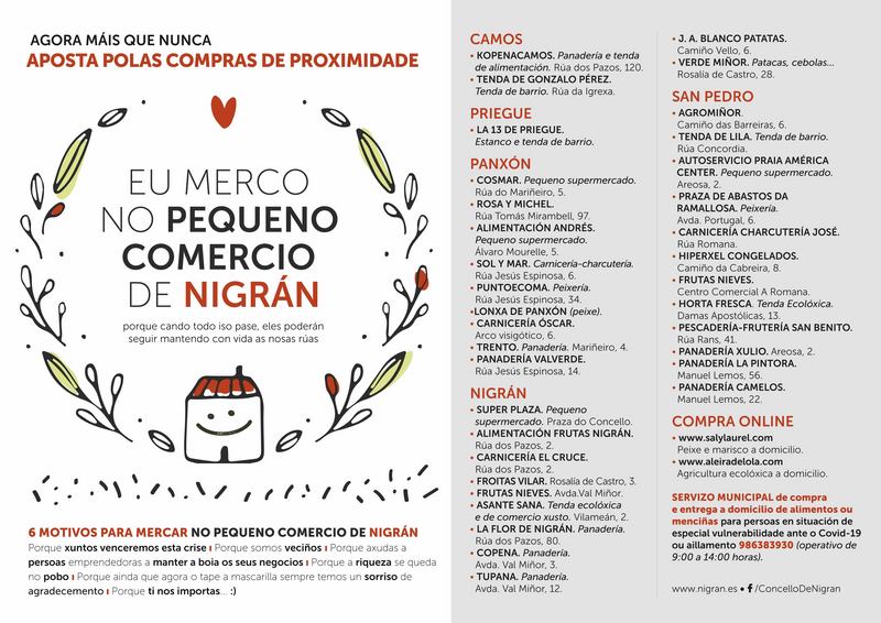 Consecuentemente, o Concello de Nigrán elaborou una cartelería específica que distribuirá en redes e nos propios locais e na que se recopila parroquia a parroquia as preto de 40 opcións de proximidade que teñen os veciños para realizar as súas compras de alimentos: pequenas tendas, froiterías, panaderías, carnicerías, peixarías… Moitas delas incluso ofrecen a posibilidade de entrega a domicilio.