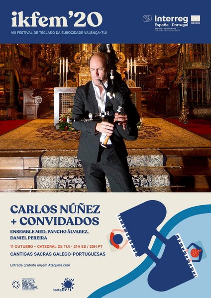Este domingo 11 de outubro será Carlos Núñez quen poña o broche de ouro á oitava edición de IKFEM cun concerto apoiado por AECT Galicia – Norte de Portugal na Catedral de Tui. Unha cita coas Cantigas sacras galego-portuguesas para a que Carlos Núñez quixo convidar a dous artistas residentes en Tui do ámbito da tecla: o seu compañeiro desde hai décadas Pancho Álvarez, que entre moitos outros instrumentos toca a zanfona, e o pianista Daniel Pereira, que tocará o órgano. Así mesmo, sendo un festival transfronteirizo, contará cun trío portugués, o Ensemble Med, que tamén conta cun instrumento de tecla inusual, a nyckelharpa nórdica, que viría ser un híbrido de zanfona e fídula. As entradas están esgotadas.
