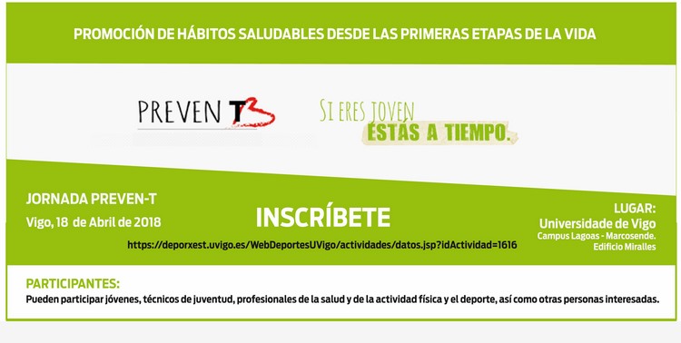 O día 18 de abril de 2018 o programa PrevenT chega á Universidade de Vigo con contidos e actividades para fomentar un estilo de vida saudable na mocidade mediante a formación e a sensibilización relativas aos hábitos de vida saudable. Así mesmo, o programa pretende informar sobre os riscos que existen para a saúde, promover a adquisición de hábitos saudables e dar a coñecer as políticas de saúde pública que estean baseadas na prevención dos diferentes factores de risco.