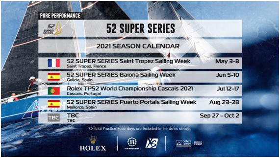 O ano que vén, unha desas etapas será a 52 SUPER SERIES Baiona Sailing Week 2021, que se celebrará durante 8 días, entre o 3 e o 10 de xuño, ambos inclusive. As primeiras dúas xornadas, os días 3 e 4, as tripulacións disputaranse regatas de adestramento na zona destinada á competición, un lugar moi próximo ao Parque Nacional das Illas Atlánticas, xusto en fronte das illas Cíes. O terceiro día, 5 de xuño, está reservado para un adestramento nunha regata xa oficial aínda que non puntuable; e nas últimas 5 xornadas, do 6 ao 10, disputarase a competición propiamente dita, coas regatas que definirán a clasificación final da que sairán os gañadores.