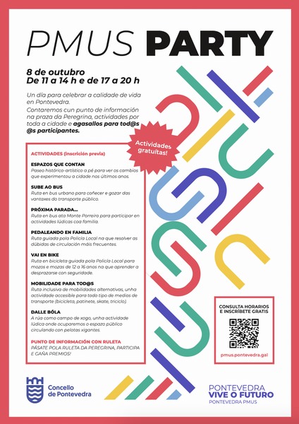O vindeiro 8 de outubro, entre as 11 e as 14 horas e de 17 a 20 horas, Pontevedra celebrará a calidade de vida da que dispón cunha cita que levará por nome ‘PMUS Party’. Trátase dunha xornada que pon o foco na socialización e na mobilidade, co xogo como base e a diversión para toda a veciñanza.