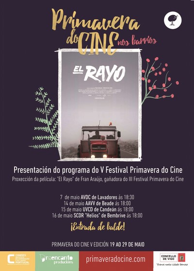 Coma xa se anunciara na rolda de prensa do pasado febreiro, o Festival Primavera do Cine ten a intención de que toda a cidade de Vigo respire cine durante a súa quinta edición. Para cumprir este obxectivo, a organización do festival ven de formar un acordo con catro asociacións de veciños de distintas parroquias de Vigo para proxectar de forma totalmente gratuíta a longametraxe El Rayo, de Fran Araújo, película gañadora da terceira edición.