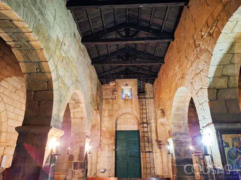 A Románica é de pranta basilical de tres naves con tres tramos, o central dobre de ancho, separados mediante piares de sección rectangular. A cabeceira conta cunha soa capela rectangular.