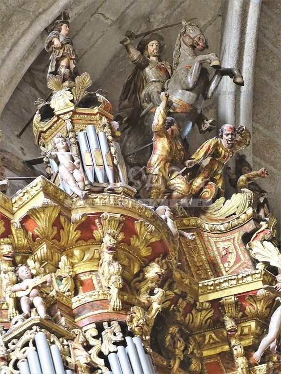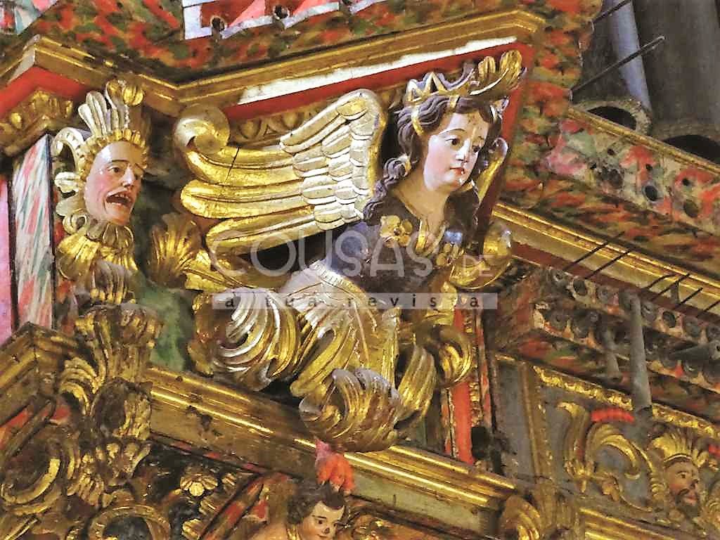 Días despois da visita a San Bartolomeu Esta vez acompañado polo director da revista, Jesús García Bastida, achegámonos á catedral para observar os detalles da decoración barroca que ornamentan os instrumentos sustentados en dous balcóns. Comprobamos a existencia dunha imaxe de San Pedro na base (pradela) do caixón do lado do órgano do evanxeo. Tamén un medallón elíptico cun relevo dunha moza sentada ao órgano a carón dun neno espido que touca outro instrumento. No da epístola, outra alegoría musical coa figura dunha muller tocando a arpa.
