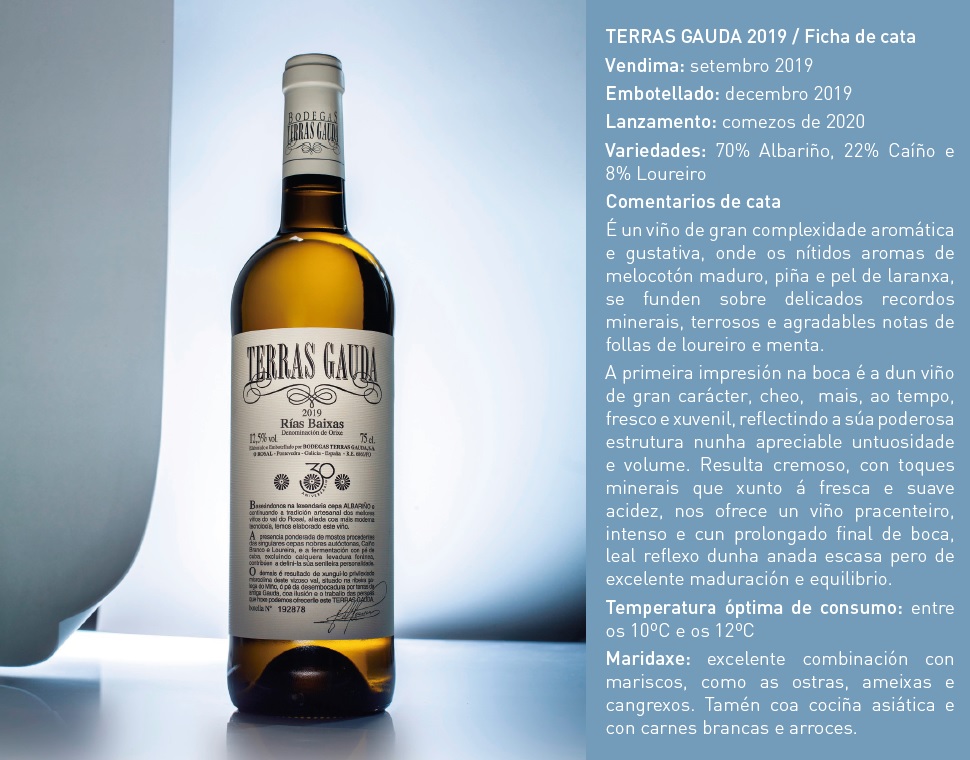 Trinta anos transcorreron xa dende que Bodegas Terras Gauda comezou a comercializar o seu buque insignia, unha mestura das nobres variedades autóctonas: Albariño, Caíño Branco e Loureiro. Un viño de marcada singularidade e personalidade que enseguida engaiolou dentro e fóra das nosas fronteiras.