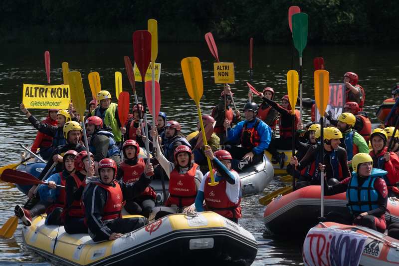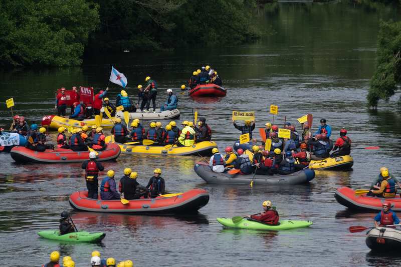 Decenas de embarcacións de ráfting, caiacs e piraguas realizaron hoxe un descenso reivindicativo polo último tramo do río Ulla, desde a Ponte de Sinde até o Campo dá Insua, en Padrón, xa moi preto da súa desembocadura na ría de Arousa. Ao final do percorrido, milleiros de persoas agardaron polas embarcacións e leron un manifesto esixindo que se descarten definitivamente o proxecto de macrocelulosa de Altri na Ulloa e a Mina de Touro.
