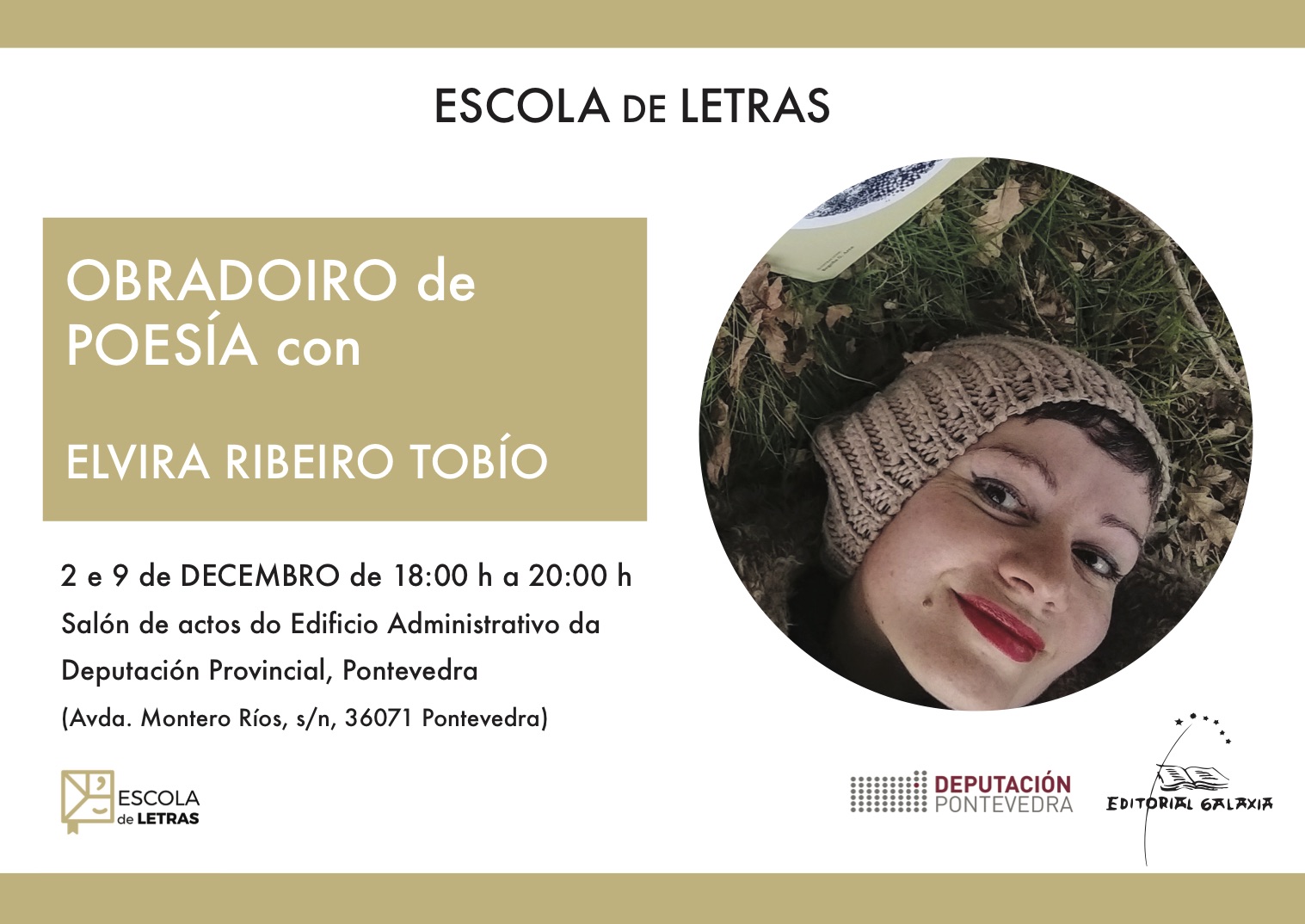 Remata o ano e con a segunda edición da Escola de Letras, impulsada pola Deputación Pontevedra e a Editorial Galaxia baixo a dirección de Francisco Castro. E faino con poesía. Este xoves arranca no edificio administrativo da institución provincial en Pontevedra o último dos obradoiros que será impartido pola escritora Elvira Ribeiro e cuxa segunda xornada terá lugar o 9 de decembro. As sesións serán de dúas horas -de 18.00 a 20.00 horas- e nelas participarán 15 persoas, que xa esgotaron as prazas para desfrutar desta actividade de carácter gratuíto.