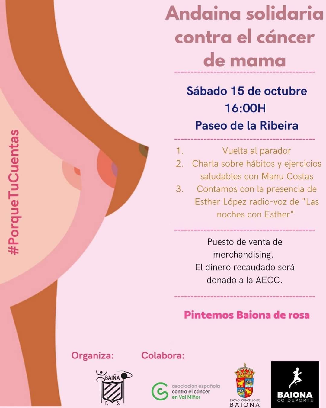 O Concello de Baiona, a través da Concellería de Deportes, e o Baíña F.S. en colaboración organizaron para mañá, 15 de outubro, unha Andaina Solidaria contra o Cancro de Mama.