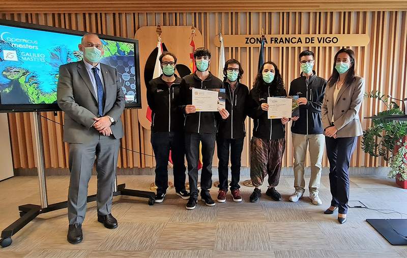 Logo de gañar os certames rexionais organizados pola Axencia Espacial Europea (ESA), Galileo e Copernicus Masters Galicia 2021, o equipo UVigo SpaceLab foi quen de quedar finalista a nivel europeo do Copernicus Masters co seu proxecto Caminito, abreviatura de Camera Based Infraestructure Integrity Tracking From Orbit, unha proposta na que as imaxes da constelación Copernicus serían usadas para a xestión e coidado do Camiño de Santiago. “Estamos entre os tres finalistas europeos do talent de Copernicus e o 14 de decembro sairemos de dúbidas se quedamos primeiros ou non”, explica Manuel Diz, director executivo responsable de xestión de proxectos do equipo UVigo SpaceLab, que este martes xunto a unha representación do equipo, integrado por alumnado de varias enxeñarías da UVigo, recollía de mans da directora xeral de Zona Franca, Inés González e do reitor, Manuel Reigosa, os premios rexionais Galileo e Copernicus Masters Galicia 2021, polos proxectos Adagio e Caminito, respectivamente.