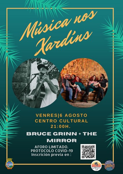 A primeira cita de Música nos Xardíns será este venres día 6 de agosto cun dobre concerto de Bruce Grinn e The Mirror, ás 21:00h. nos Xardins do Centro Cultural. Como ven sendo habitual o evento conta con protocolo COVID-19, sendo precisa a inscrición previa a través do enlace: https://www.woutick.es/evento/1594/entradas-axenda-cultural-a-guarda, e debendo seguir o concerto sentado, con mascarilla e coa distancia de seguridade preceptiva.