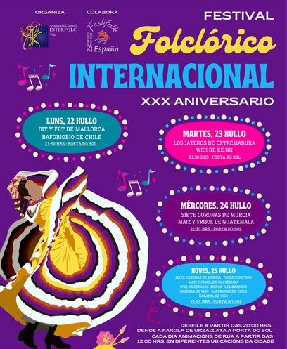 A Asociación Cultural Interfol organiza, coa colaboración do Concello de Vigo, a trixésima edición do Festival Folclórico Internacional de Vigo, que terá lugar do luns 22 ao xoves 25 de xullo, con actuacións diarias na Porta do Sol ás 21:30 horas, a excepción do evento de peche, o xoves 25 de xullo, que comenzará ás 21 horas. Ademais, cada día haberá animacións na rúa a partir das 12 horas, en diferentes ubicacións da cidade.