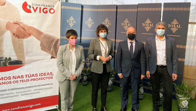 O delegado do Consorcio da Zona Franca de Vigo, David Regades, asinou un protocolo coa alcaldesa de Tomiño, Sandra González, o alcalde da Guarda, Antonio Lomba e a alcaldesa do Rosal, Ánxela Fernández, en Viveiros O Toxal para analizar o sector no Baixo Miño